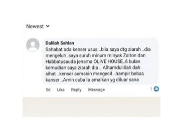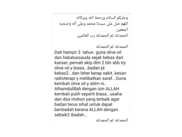 My friend had colon cancer. I advised her to drink Olivie Plus 30x and Black Seed Oil. Six months later, I visited her again, and Alhamdulillah, she had recovered—the cancer had shrunk and was almost gone, Ameen. Those out there, give it a try!